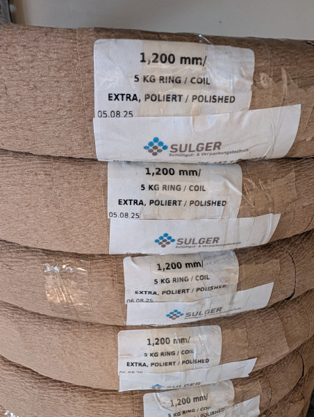 Wir verwenden für die Verpackung des Abschneidedrahtes nun Krepppapier. Dadurch ist der Draht immer "frisch" , und behält seinen leichten Ölfilm der in der Produktion im Stahlwerk aufgetragen wird.